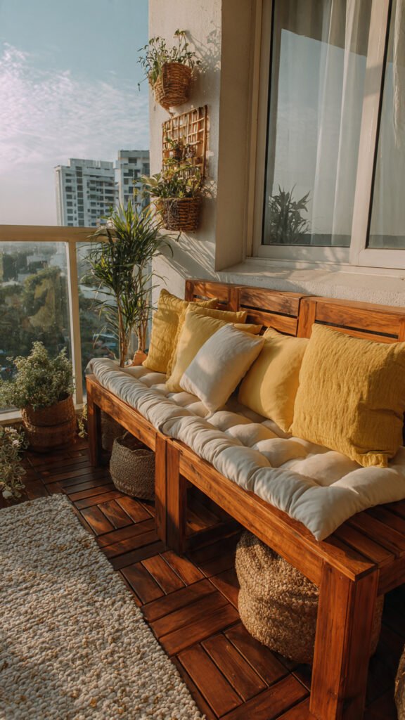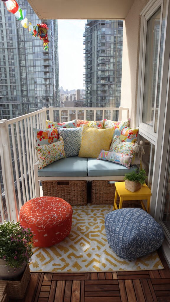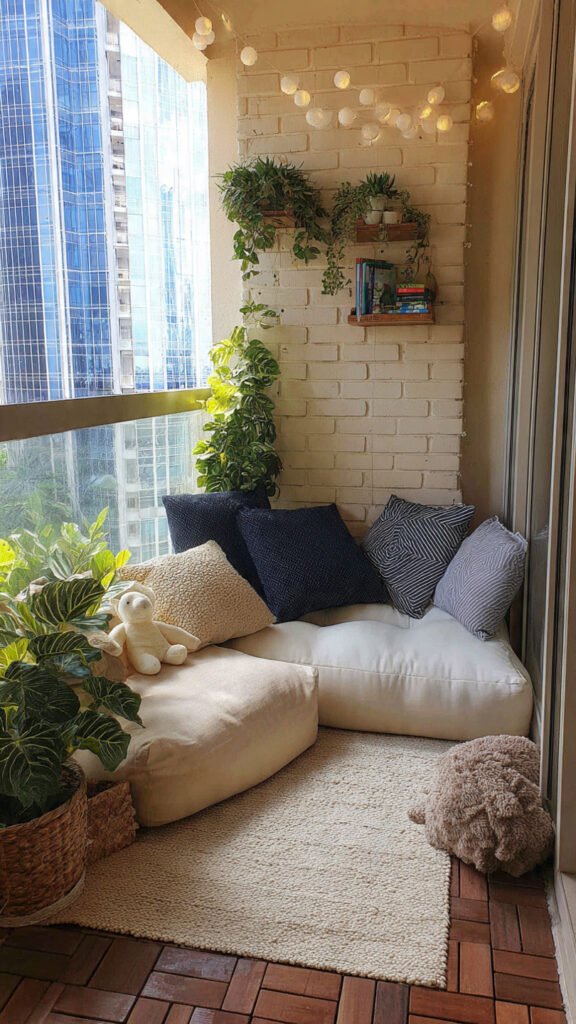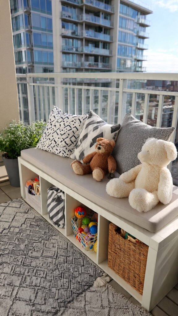 Seating with storage is a game changer. I love how toys can be hidden but still accessible. The balcony stays tidy. Kids feel like the space is theirs. Doesn’t organization reduce stress? This idea does double duty.