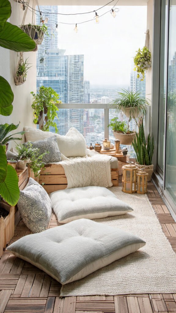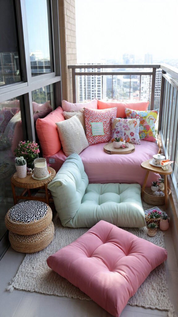 Floor cushions are one of the easiest seating solutions for kids. I love how they let kids sit, sprawl, or move around freely. The balcony feels relaxed instead of structured. There’s no pressure to “sit properly.” Doesn’t flexibility make kids more comfortable? It keeps things chill and fun.