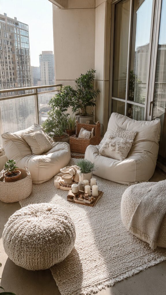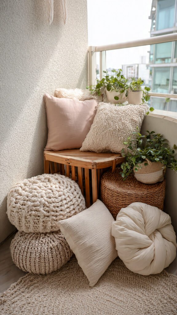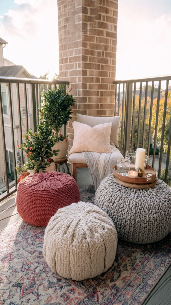 Poufs are great because they’re soft but structured. I love how kids can use them as seats or footrests. The balcony feels cozy and adaptable. Nothing feels rigid. Doesn’t multi-use seating make small spaces smarter? Poufs are underrated.