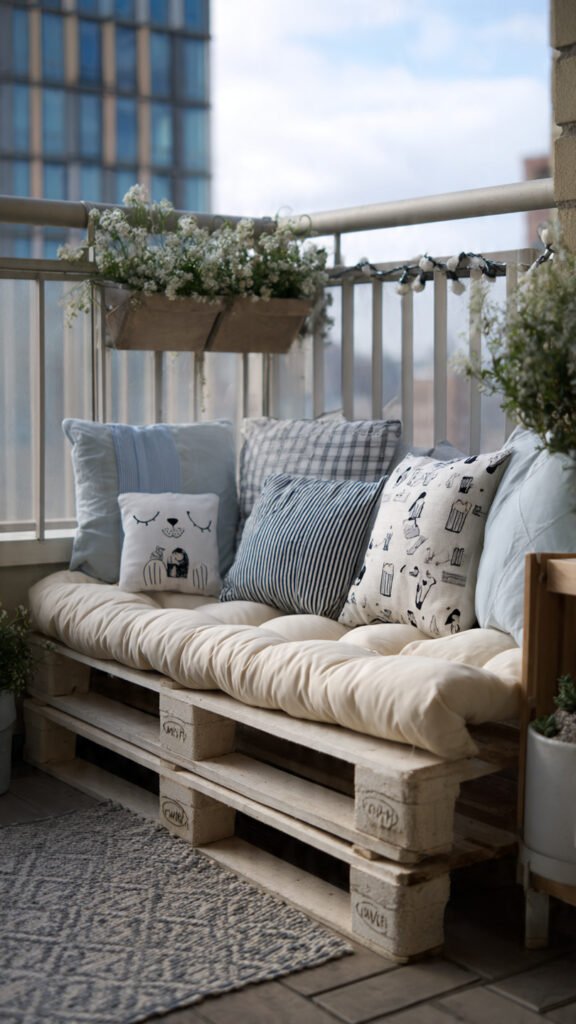 A pallet bench is sturdy, low, and perfect for kids. I love how easy it is to build and customize. Add cushions and suddenly it’s cozy seating. The balcony feels intentional but playful. Doesn’t handmade furniture feel more special? Kids love sitting on something you made.