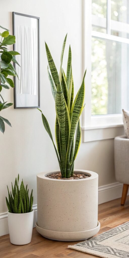 Pro Tip: Choose easy-care plants like snake plants.