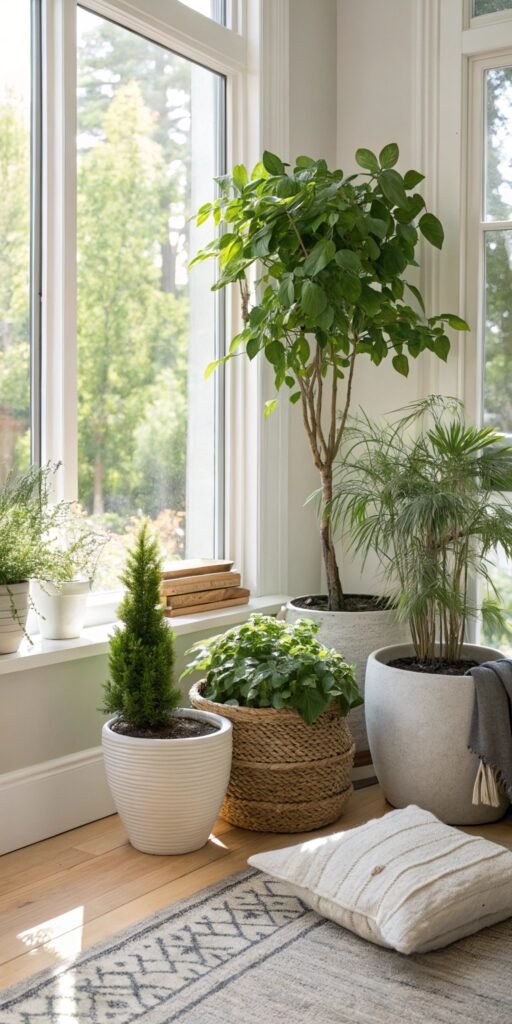 A trio of flowering plants instantly brightens any space. I love choosing three complementary colors for a cohesive look. The setup feels intentional and lively. Nothing feels overwhelming. Doesn’t grouping plants make styling easier? It’s simple but impactful.