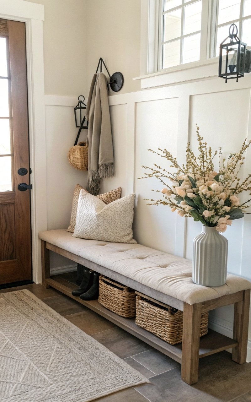 I styled an entry bench with a small floral arrangement, and it created a cozy, functional focal point. The flowers soften the seating area. It feels welcoming and comfortable. The setup looks intentional. It’s simple, but effective. Pro Tip: Keep decor minimal for balance.