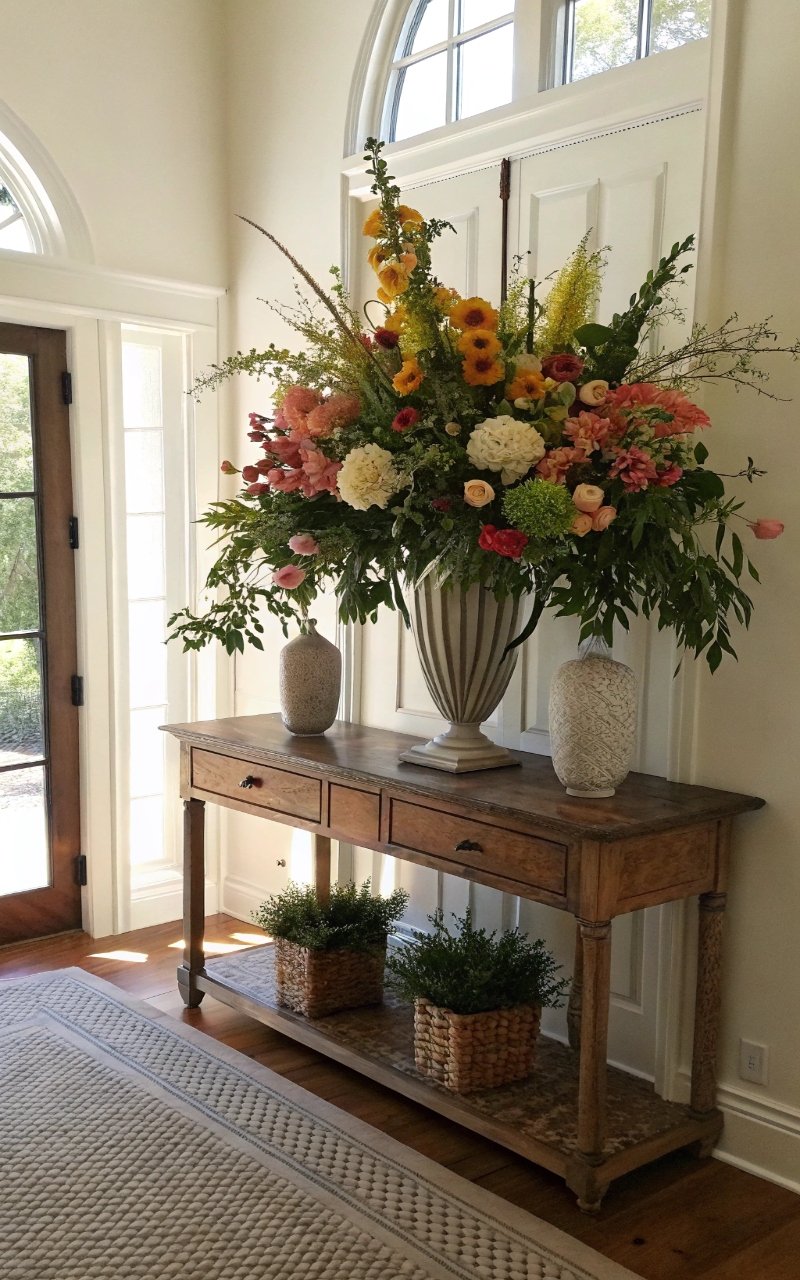 I placed a large floral arrangement on my entryway table, and it instantly became the focal point that draws your eye the moment you walk in. The height adds presence without cluttering the space. The colors bring life into the room. It feels fresh and intentional. It’s simple, but very effective. Pro Tip: Choose seasonal flowers for a natural look.