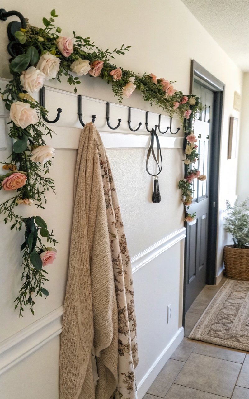 I draped a floral garland across entry hooks, and it softened the space while adding a decorative layer. The flowers create movement. It feels relaxed and inviting. The design adds texture. It’s simple, but effective. Pro Tip: Use faux flowers for durability.