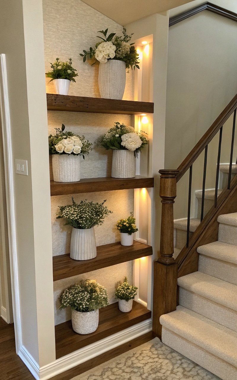 I added small floral arrangements on shelves, and they created a layered look that feels intentional without clutter. The repetition ties the space together. It adds depth without overwhelming. The details feel soft and balanced. It’s simple, but charming. Pro Tip: Vary heights for visual interest.