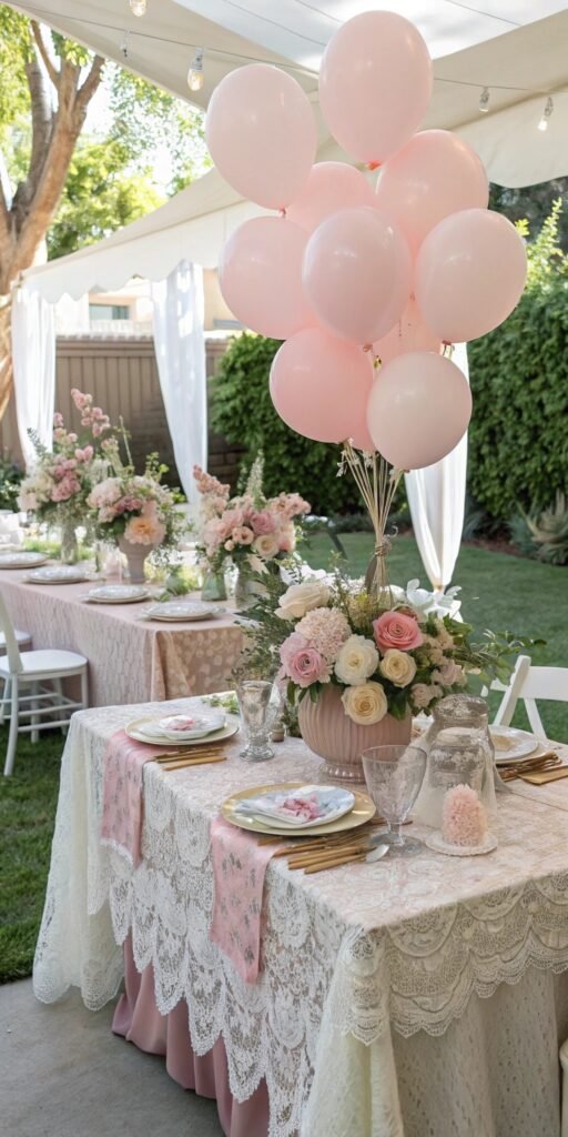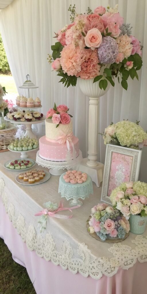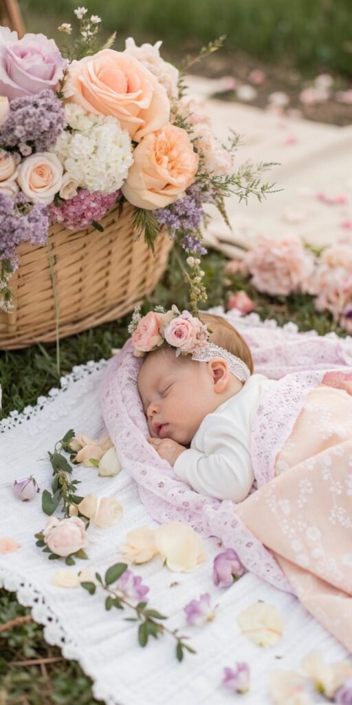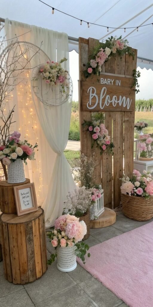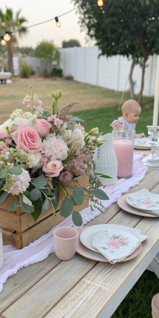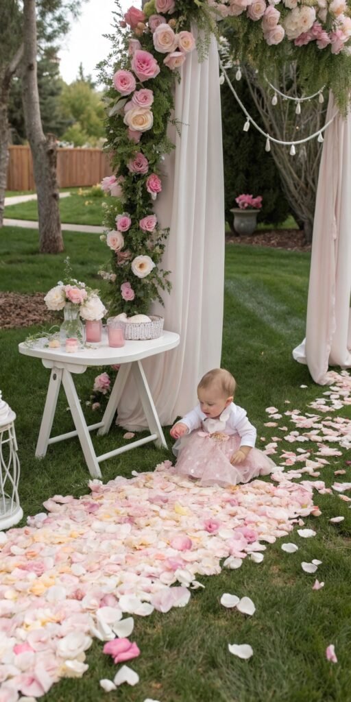 Floral confetti adds whimsical charm. I love scattering petals gently across the table. The setup feels celebratory yet delicate. Texture feels light. Doesn’t softness define Baby in Bloom styling? Petals create effortless romance.
