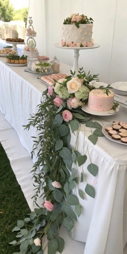 Greenery runners instantly create a garden atmosphere. I love how soft leaves flowing across the table add texture and freshness. The setup feels natural and breathable. Florals feel grounded. Doesn’t greenery always soften decor beautifully? It brings effortless elegance.