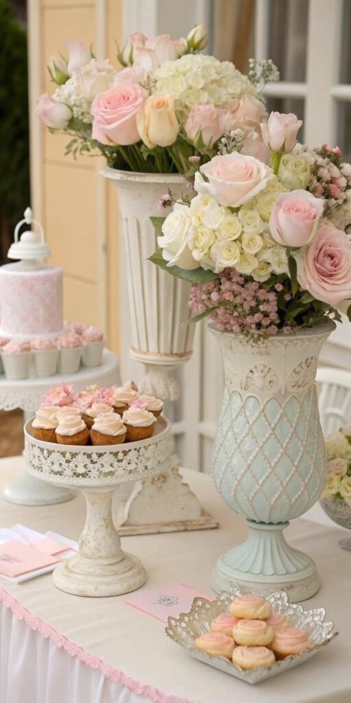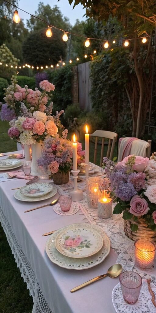 Vintage vases enhance the garden aesthetic beautifully. I love mixing delicate glass, ceramic, or distressed finishes. The table feels layered and storied. Texture becomes visual poetry. Doesn’t vintage decor add emotional warmth? It elevates the entire setup.