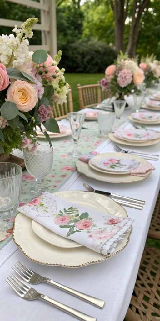 Garden-style place settings feel soft and inviting. I love neutral plates paired with floral or pastel napkins. The table feels cohesive. Nothing competes visually. Doesn’t balance create elegance? Gentle layering defines the aesthetic.
