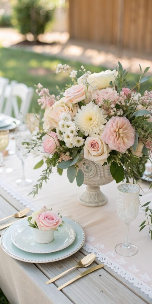 Loose, garden-style floral arrangements feel effortlessly romantic. I love how blooms placed naturally instead of tightly structured create softness instantly. The table feels alive and airy. Nothing feels rigid. Doesn’t organic styling feel more inviting? Garden-inspired florals add charm without feeling formal.