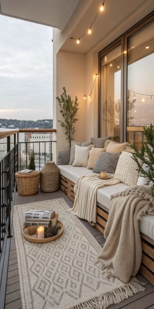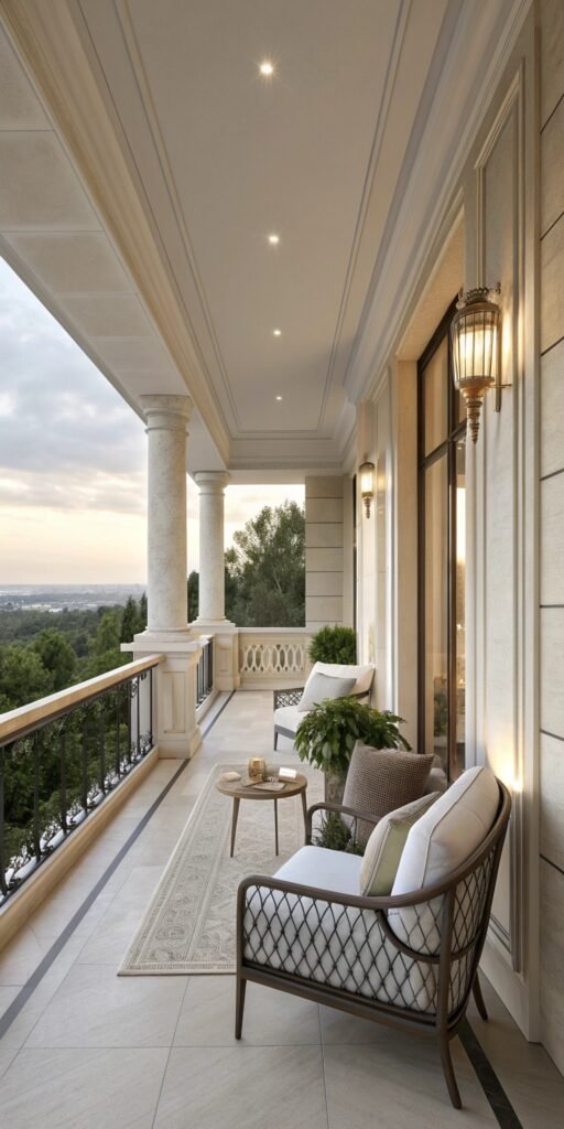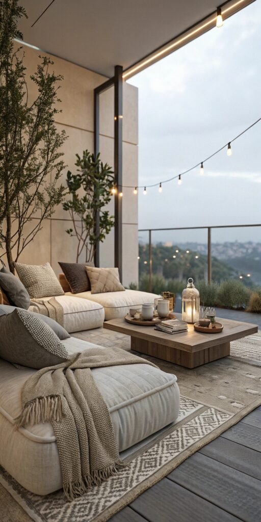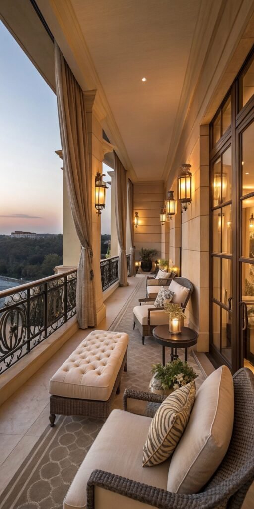 High-end balcony styling works beautifully because it prioritizes balance, cohesion, and atmosphere rather than excess. Clean palettes, layered textures, and warm lighting create spaces that feel polished and effortlessly refined.