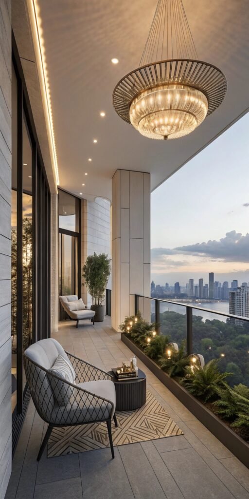 Statement lighting defines high-end design. I love sculptural pendants or bold lanterns. The balcony feels artistic and refined. Nothing feels ordinary. Doesn’t lighting anchor mood? Statement fixtures elevate effortlessly.