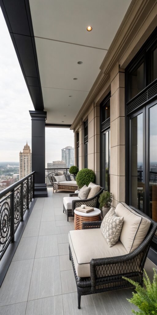 Black accents introduce instant drama. I love how dark elements anchor lighter palettes beautifully. The balcony feels bold yet refined. Nothing feels overpowering. Doesn’t contrast define luxury? Black adds timeless modern elegance.