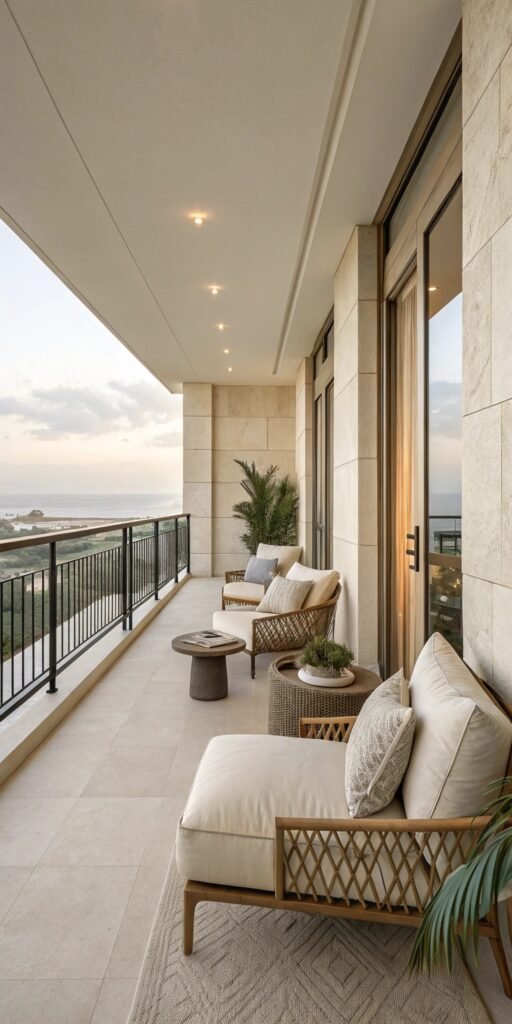 Neutral palettes instantly signal sophistication. I love how soft beige tones, clean furniture lines, and restrained styling create visual calm. The balcony feels polished and intentional. Nothing feels cluttered. Doesn’t simplicity always feel more expensive? Minimalism defines modern luxury beautifully.