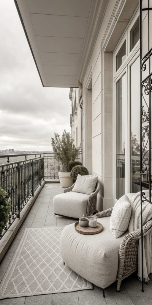 Monochrome palettes create strong visual harmony. I love how consistent tones make balconies feel curated and designer-like. The space feels cohesive and calm. Nothing competes visually. Doesn’t continuity define refinement? Monochrome styling feels timelessly elegant.