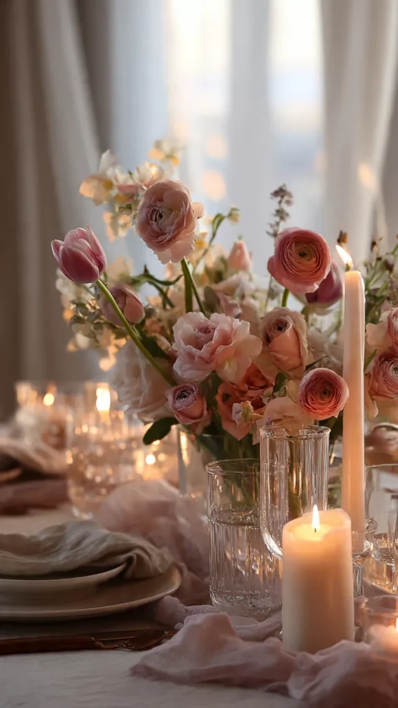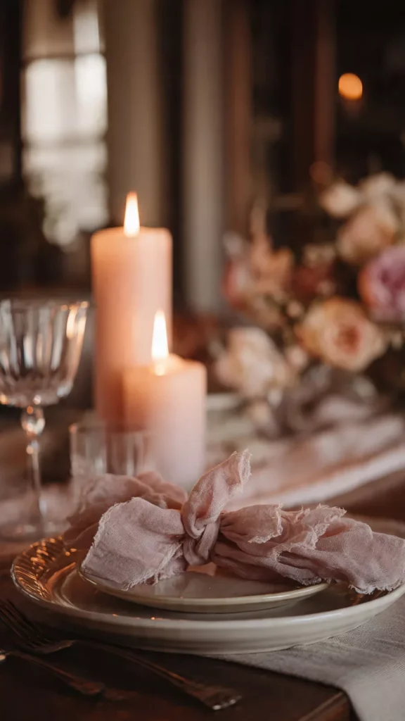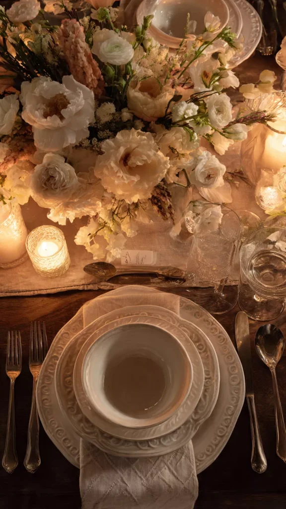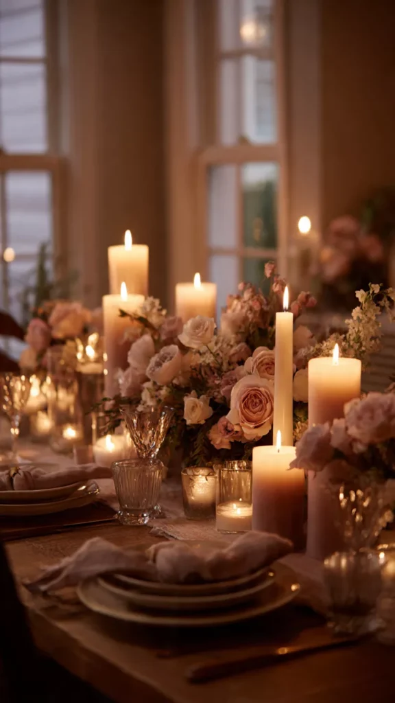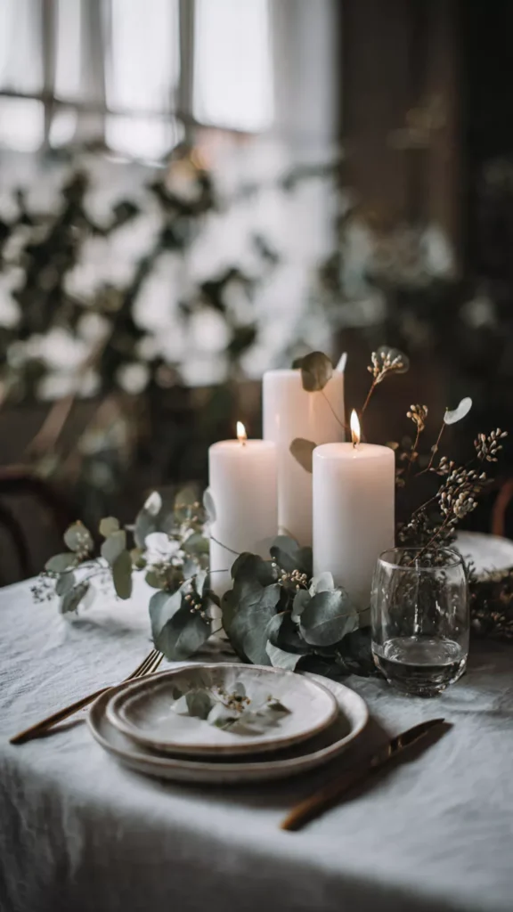 A centerpiece doesn’t need to be elaborate to feel romantic. A few candles paired with greenery feels organic and calm. I’ve found simplicity keeps the table from feeling crowded. Isn’t restraint part of elegance? This approach feels balanced and intimate.