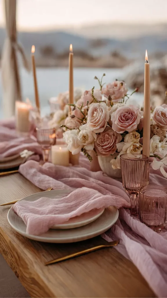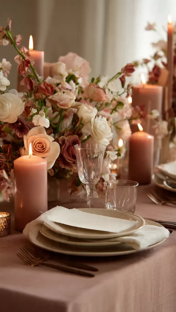Soft reds, blush, cream, and warm neutrals feel romantic without overwhelming the table. This palette reads elegant rather than themed. I’ve found muted tones feel calmer and more inviting. Isn’t subtle color more emotional than bold contrast? This balance feels grown-up and intentional.