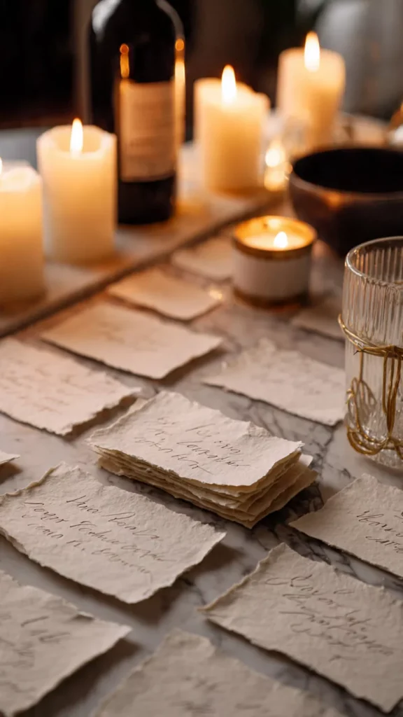 A small menu card or handwritten note adds romance and intention. It slows the moment and makes the dinner feel planned with care. I’ve found these notes become keepsakes. Don’t words add emotional weight? This detail feels personal and meaningful.