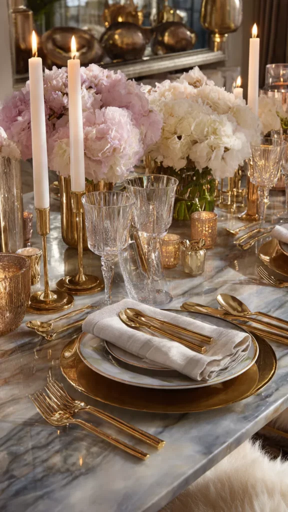 Brass, gold, or rose-gold accents add warmth and glow under candlelight. Flatware, chargers, or small trays work beautifully. I love how metals catch light softly at night. Isn’t shine better when it’s gentle? This detail adds sophistication.