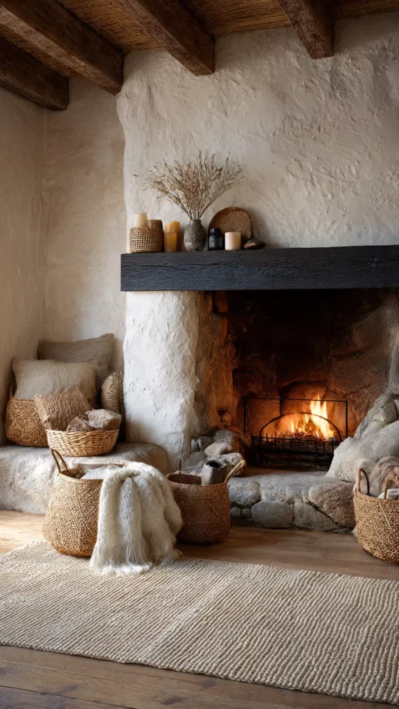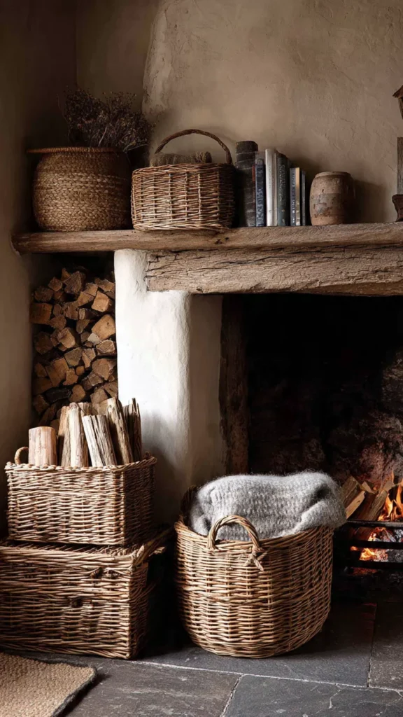 Baskets add storage and texture while keeping the vibe relaxed and natural. They’re perfect for logs, blankets, or magazines. I’ve always loved how woven materials feel warm and approachable. Doesn’t texture make everything cozier?