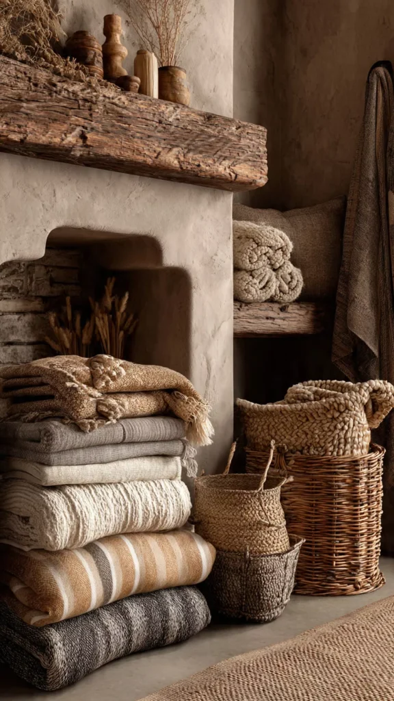 Blankets, knit throws, or woven baskets filled with soft linens make the hearth feel nurturing and homey. I love how textiles invite you to relax. Isn’t coziness the whole point of a fireplace?