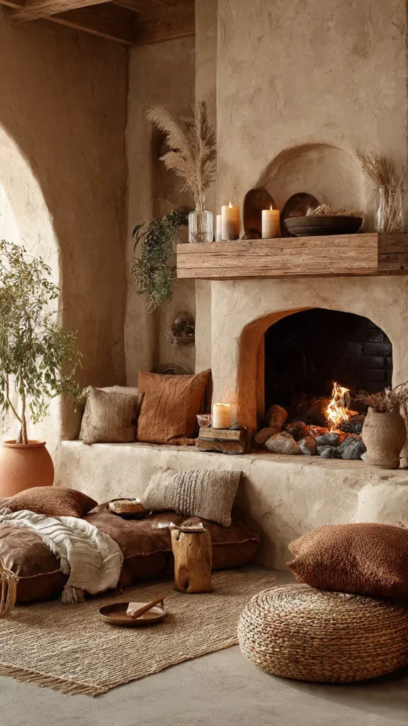 Rustic decor shines through warm neutrals—browns, creams, terracotta, and muted greens. These shades wrap the hearth in comfort. I love how earthy tones never fight for attention. Doesn’t the palette itself feel grounding?