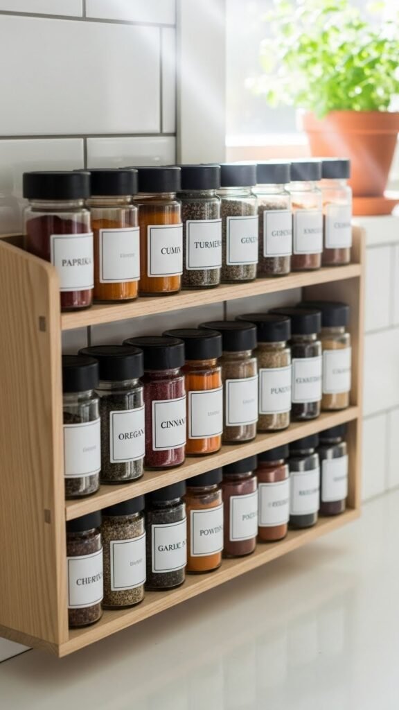 A neatly arranged spice rack keeps cooking easy and organized. I love how labels and uniform jars look so clean. It saves time while cooking. The kitchen feels more functional. Doesn’t quick access make a big difference? It’s a small but powerful detail.