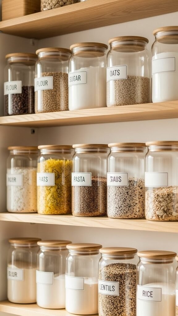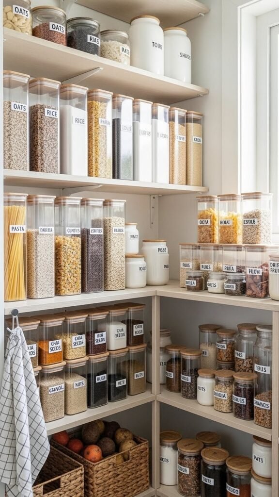Clear containers keep pantry items visible and beautifully organized. I love how they create a clean, uniform look. You always know what you have. The pantry feels calm and tidy. Doesn’t seeing everything make it easier to stay organized? It’s a Scandinavian favorite.