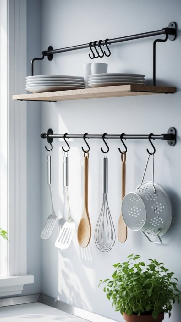 Wall-mounted rails free up drawer space and keep tools close at hand. I love how it adds function without clutter. The kitchen feels more open. Everything has its place. Doesn’t vertical storage feel smart? It’s practical and stylish.