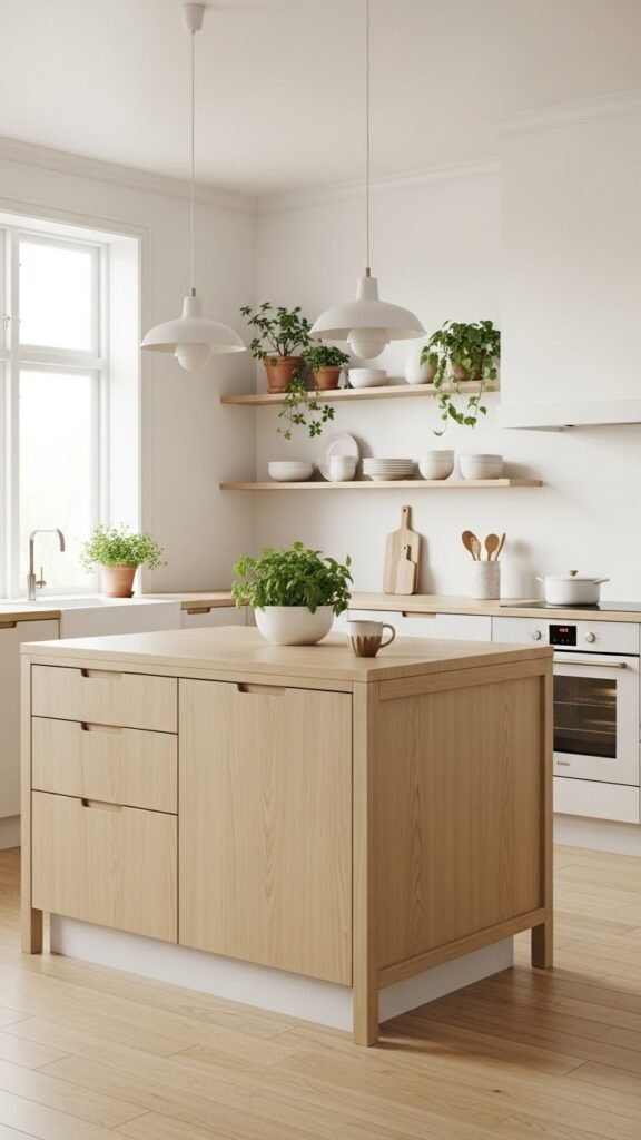 An island with built-in storage adds both workspace and organization. I love how it keeps everything close while cooking. It becomes the heart of the kitchen. The design stays clean and functional. Doesn’t extra storage always help? It’s a Scandinavian favorite.