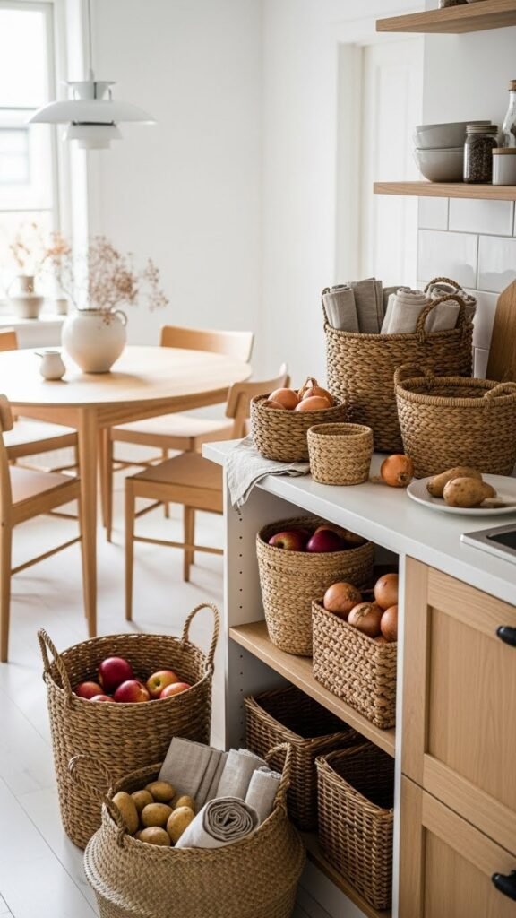 Baskets add warmth and texture while keeping items grouped together. I love using them for produce, linens, or pantry goods. They keep things tidy while still looking cozy. It’s organization with charm. Doesn’t natural material feel more inviting? It’s perfect for Scandinavian style.