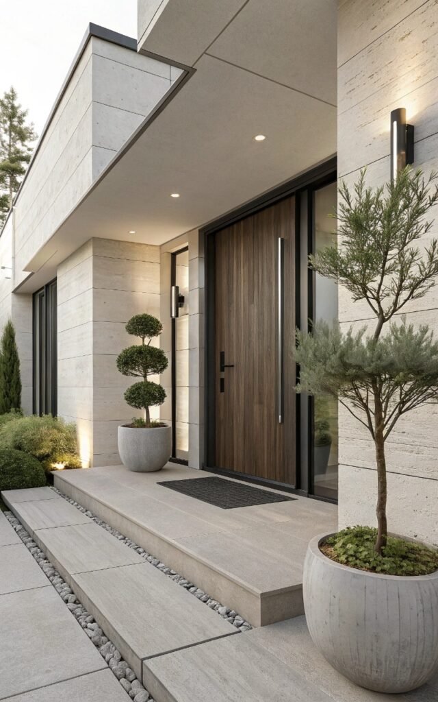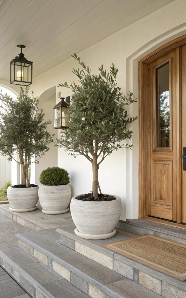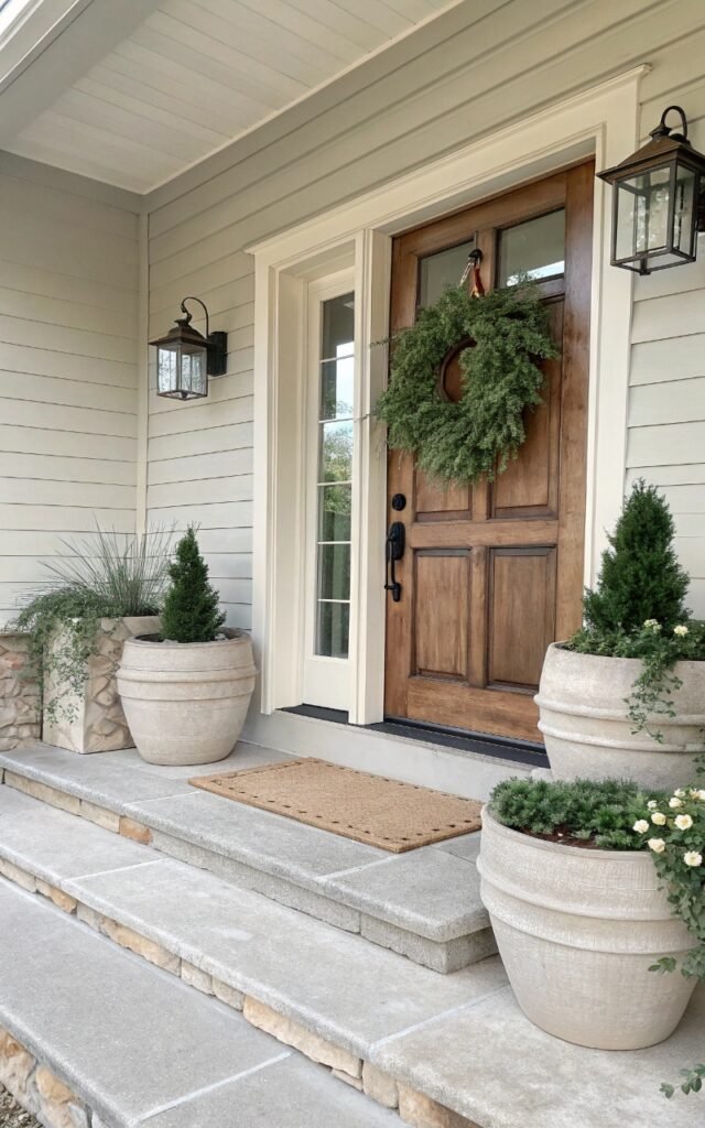 Matching planters on both sides of the door create instant symmetry. I love tall planters with simple greenery. The entry feels structured and elegant. Nothing feels random. Doesn’t symmetry always look polished? It’s a designer trick.