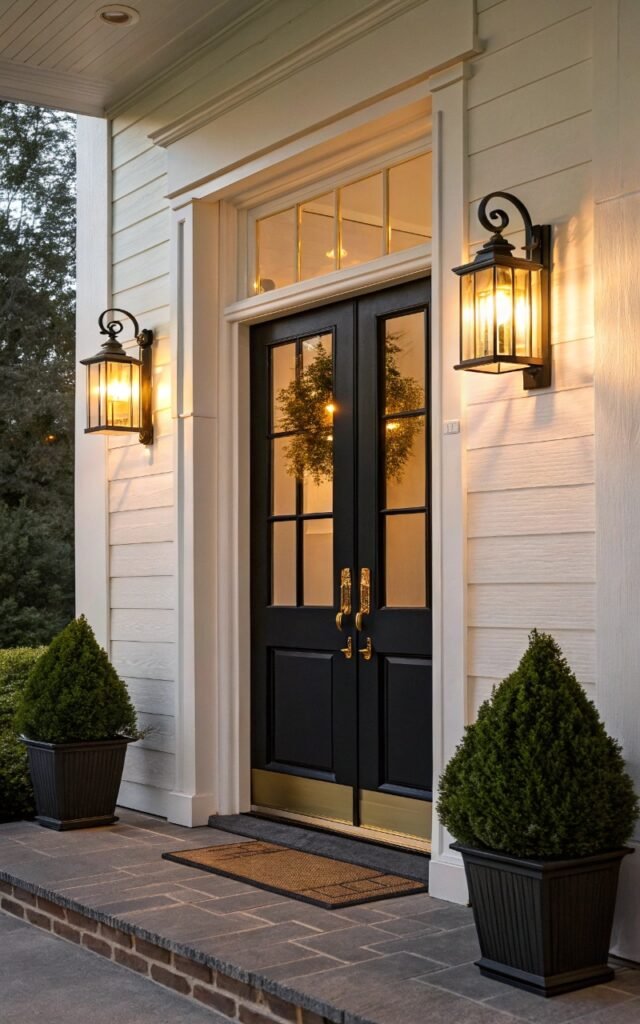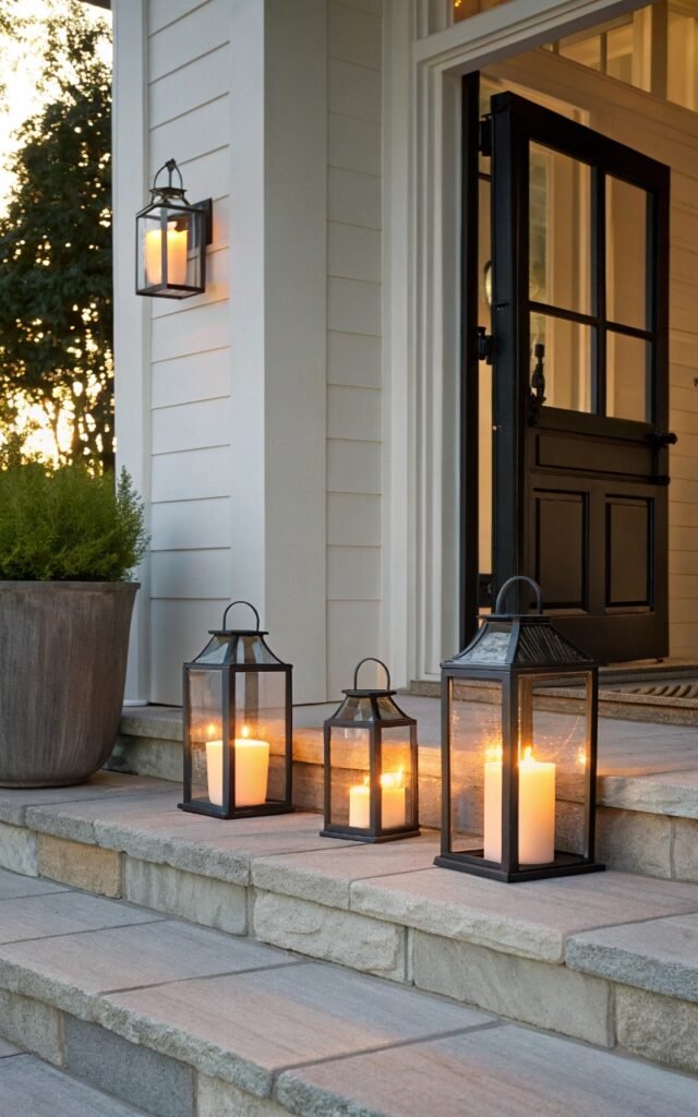 Black lanterns add timeless sophistication. I love placing one or two beside the doorway. The soft glow feels warm at night. Nothing looks overly decorated. Doesn’t lighting create atmosphere? It’s simple but refined.