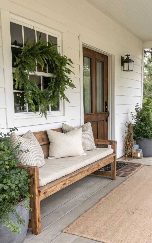 A small bench near the door adds charm and function. I love placing a simple cushion or pillow on top. The porch feels cozy instantly. Nothing looks empty. Doesn’t seating make a space welcoming? It adds relaxed elegance.