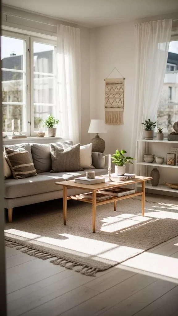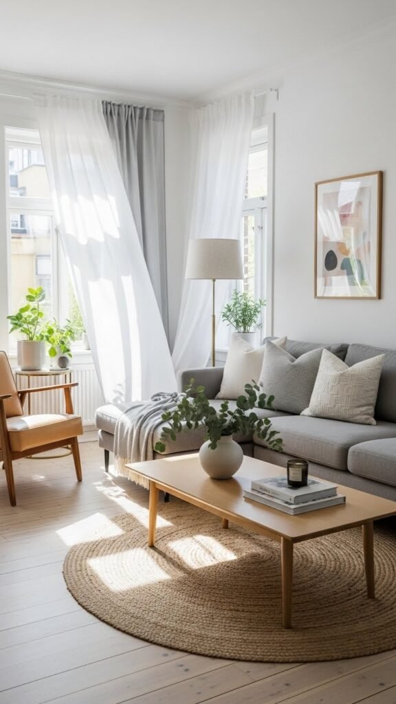 Sheer curtains or light blinds keep windows bright and airy. I love how they soften light without blocking it. The room feels open and relaxed. Heavy drapes can make a small room feel closed in. Doesn’t light fabric feel refreshing? It’s perfect for Scandinavian spaces.