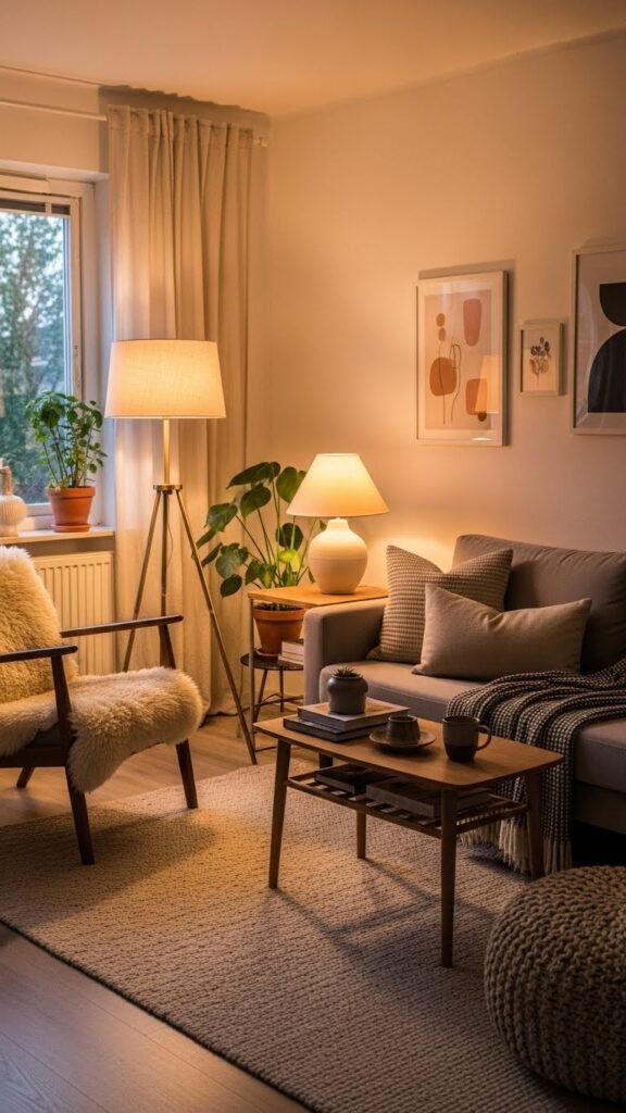 Layered lighting makes a small living room feel cozy without being dark. I love using floor lamps and table lamps for warmth. It creates depth and comfort. The space feels more inviting. Doesn’t warm light make a room feel welcoming? It adds dimension.