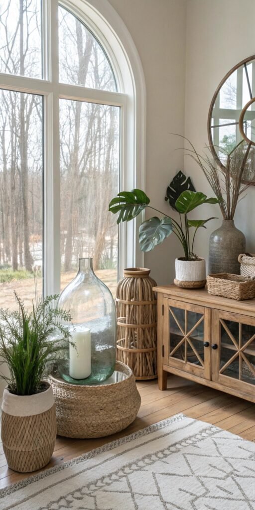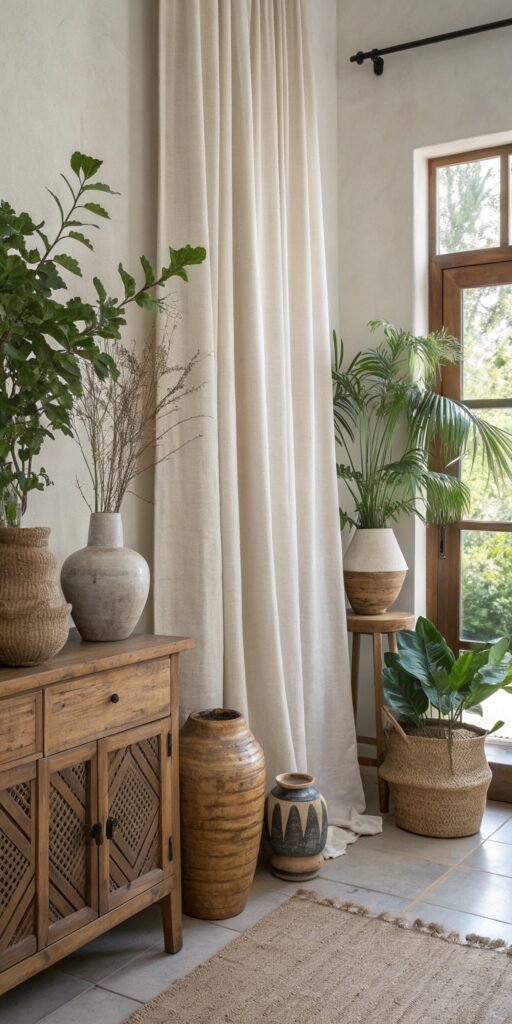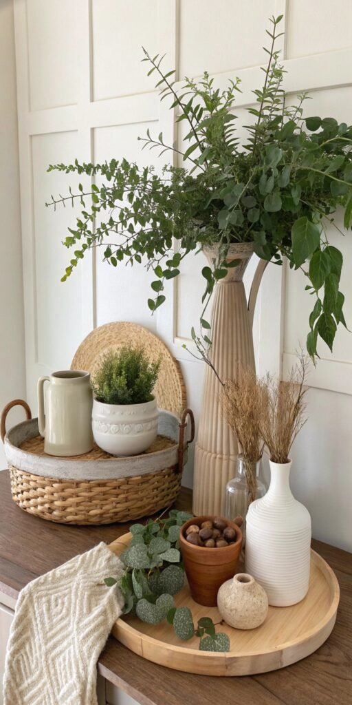 Vignettes add subtle charm. I love combining greenery, ceramics, and natural textures. The space feels curated yet effortless. Nothing feels staged. Doesn’t thoughtful styling enhance warmth? Organic displays elevate interiors beautifully.