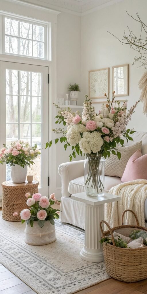 Florals breathe life into spring decor. I love loose, natural arrangements with gentle movement. The space feels fresh and calming. Nothing feels rigid. Doesn’t nature define beauty effortlessly? Flowers enhance organic styling beautifully.