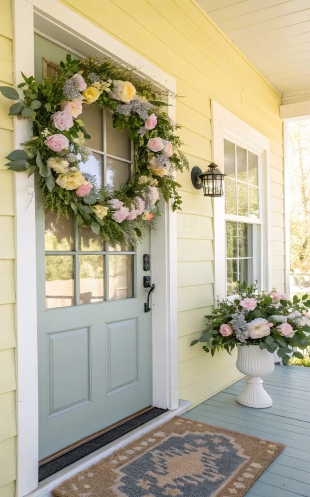 A spring wreath instantly brings life to a front door. I love wreaths filled with pastel flowers, greenery, or even soft ribbons. The entrance feels cheerful right away. Nothing looks dull anymore. Doesn’t a wreath make the door feel complete? It’s the easiest seasonal upgrade.