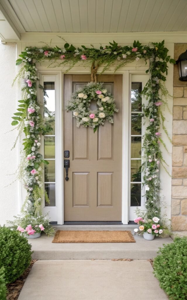 Garlands draped around the door frame feel lush and festive. I love greenery mixed with tiny flowers. The door looks framed beautifully. Nothing feels boring. Doesn’t greenery instantly feel fresh? It adds seasonal charm.