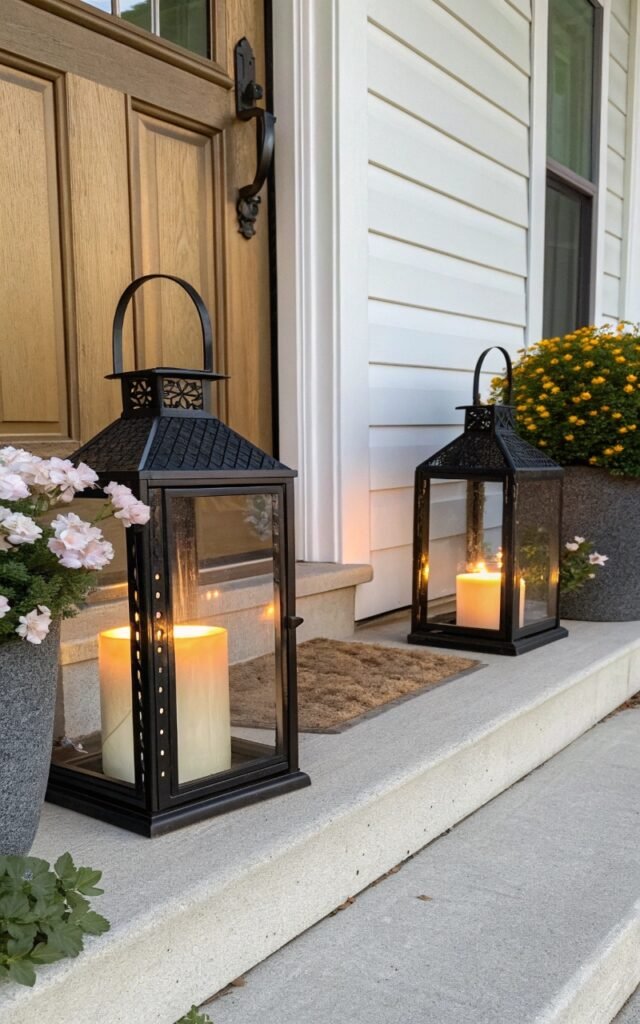 Lanterns create charm and warmth. I love placing one or two lanterns near the door with LED candles. The glow feels welcoming at night. Nothing feels cold. Doesn’t soft lighting make a porch magical? It’s cozy and elegant.