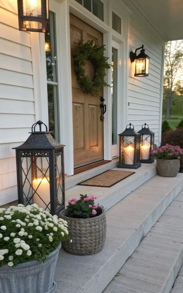 Grouping lanterns with flowers creates a styled vignette. I love placing lanterns beside potted blooms. The porch feels curated and welcoming. Nothing feels random. Doesn’t grouping decor look intentional? It adds visual balance.