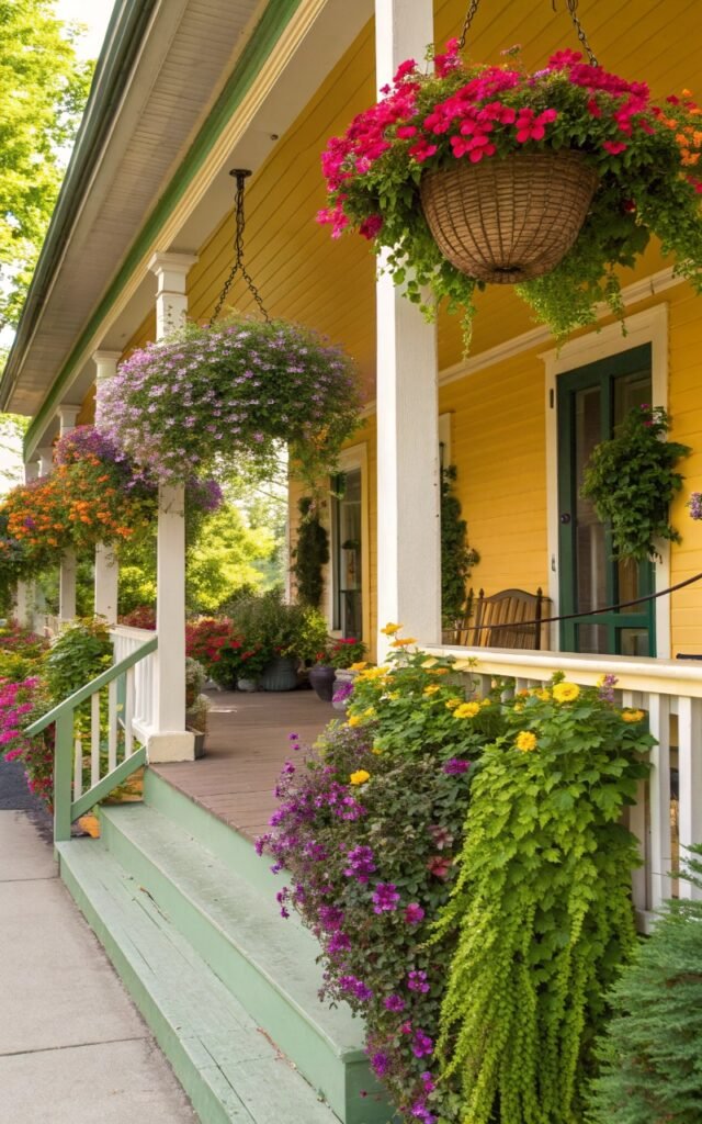 Hanging baskets add height and color. I love trailing flowers spilling over the edges. The porch feels full of life. Nothing looks flat. Doesn’t vertical decor create interest? It’s beautiful and easy.