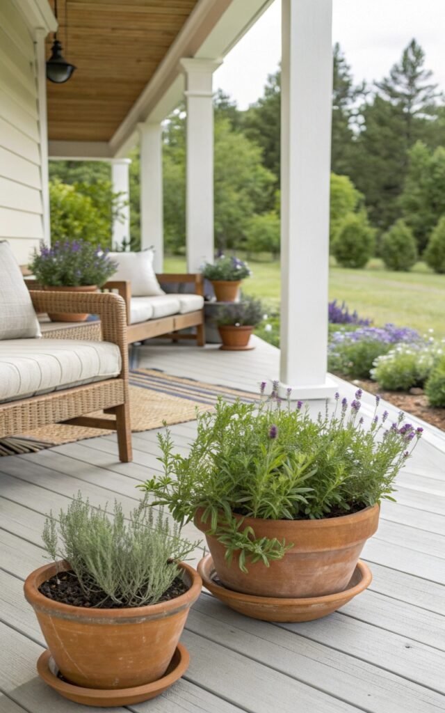Herbs like rosemary or lavender smell amazing on a porch. I love placing them in small pots near seating areas. The porch feels fresh and natural. Nothing feels artificial. Doesn’t greenery make spaces feel alive? It’s beautiful and practical.