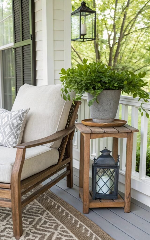 A tiny table beside a chair makes the porch feel complete. I love placing a plant or small lantern on it. The seating area becomes functional. Nothing feels unfinished. Doesn’t small furniture make spaces cozy? It’s practical decor.