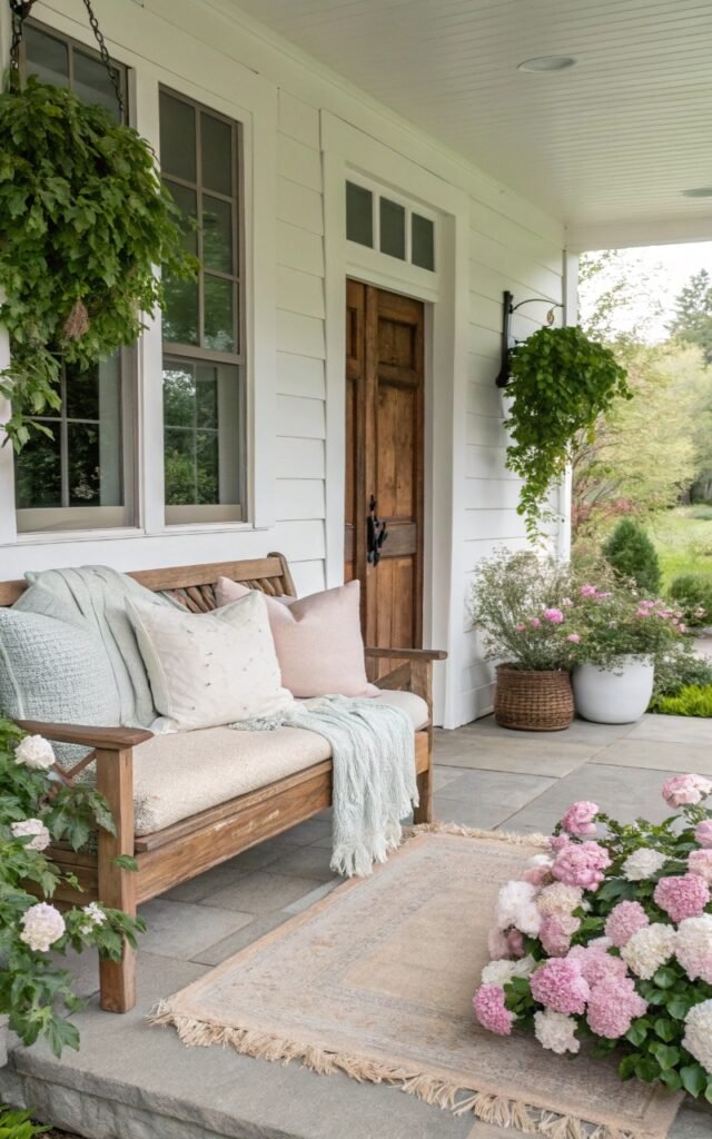 A small bench makes the porch feel inviting. I love styling it with pillows or a light throw. The entrance becomes cozy and functional. Nothing feels empty. Doesn’t seating make spaces welcoming? It’s perfect for relaxing outdoors.