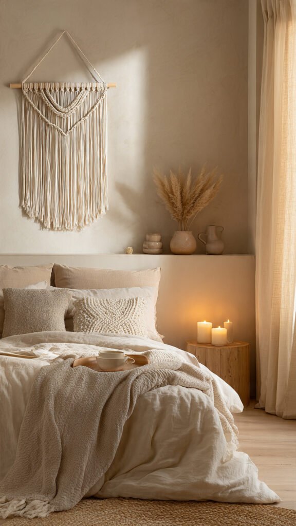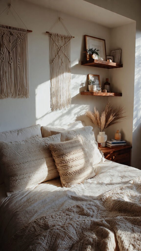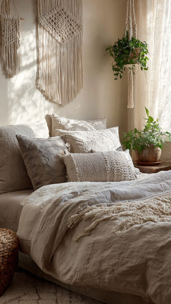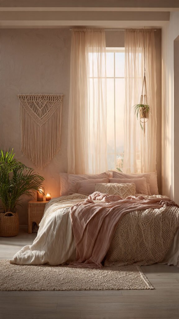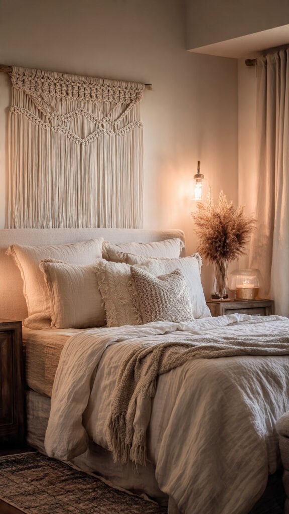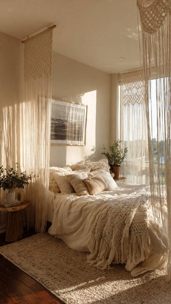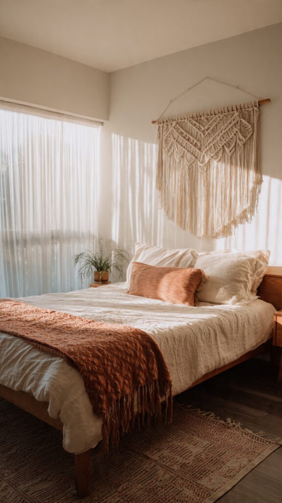 Soft blush, dusty rose, or muted gray macrame adds gentle character. I love how subtle color keeps things modern. The bedroom feels styled but calm. Nothing feels loud. Doesn’t gentle color feel more sophisticated? It adds warmth quietly.