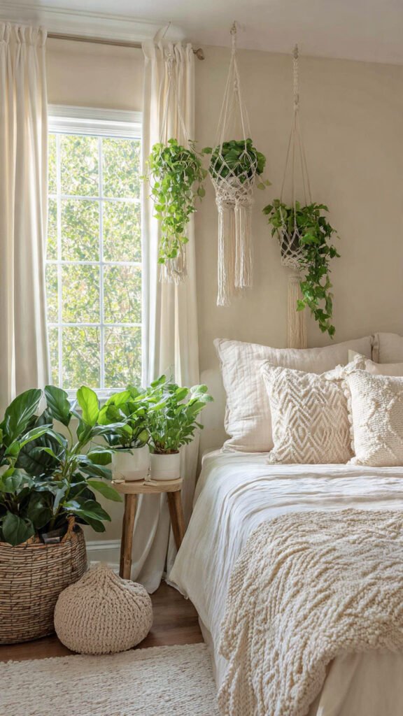Macrame and greenery are a perfect bedroom pairing. I love how hanging plants soften corners instantly. The room feels fresh and layered. Vertical interest adds life. Doesn’t suspended greenery feel effortlessly relaxing? It enhances the vibe beautifully.