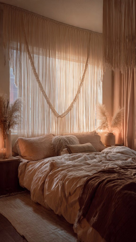Macrame curtains feel airy and romantic. I love how they filter light gently. The room feels breezy and relaxed. Windows gain character. Doesn’t soft movement change a bedroom’s mood? It adds gentle drama.